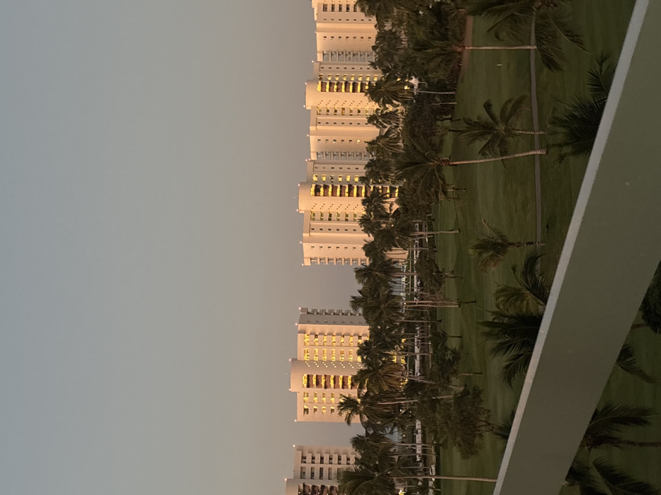 An elevated view captures a resort area in Acapulco de Juárez, Mexico, during twilight conditions, likely sunset. In the foreground, a light-colored, horizontal balcony railing runs across the bottom of the frame. The midground features an expansive, manicured golf course characterized by lush green grass and numerous palm trees of varying heights, interspersed with some smaller trees and winding pathways. In the background, a series of at least seven multi-story, light-colored buildings, consistent with residential towers or hotels, extend horizontally across the scene. These structures exhibit multiple windows and balconies, many of which are illuminated with a prominent golden-orange light, indicating direct sun exposure from a low angle. The sky above is clear, displaying a gradient from a warm, faint orange near the horizon to a pale blue-grey overhead. No individuals or active movements are discernible within the frame.