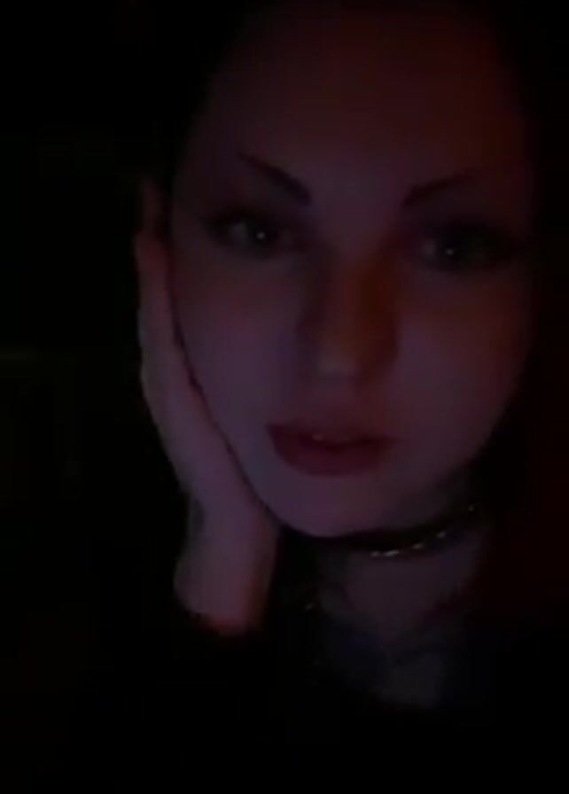 A woman is looking directly at the camera. She's wearing a dark-colored top, a choker, and a necklace. She has light-colored skin, red lipstick, and her eyebrows are arched and thin. Her eyes are light-colored, and her hair is dark with red undertones. Her right hand is resting on her cheek as she speaks. The lighting is dim and casts shadows across her face.