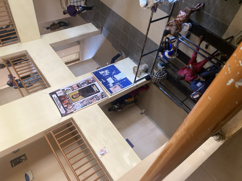 The image depicts an interior view of a multi-story building within the city of Baganakwo, Nigeria, observed from an elevated perspective