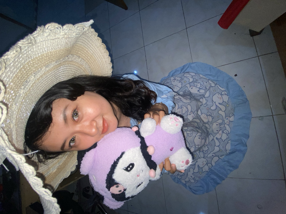 An indoor scene in Gelam, Indonesia, depicts a female subject in a crouching or kneeling position on a light-colored square-tiled floor. The subject, who appears to be of East or Southeast Asian descent, wears a wide-brimmed, light-colored straw hat with a ruffled edge, a light blue long-sleeved top, and a light blue skirt or dress patterned with white cartoon rabbits. A gold-colored bracelet is visible on her left wrist. She has dark, wavy hair, light-colored eyes (possibly contact lenses), and is wearing reddish-orange lip color, smiling directly at the camera. She holds a light purple and white plush toy, resembling the character Kuromi, close to her chest with both hands. The environment is dimly lit, with artificial light illuminating the subject. The background is dark and indistinct, with minimal visible details. A small red object is partially visible on the floor in the lower right.
