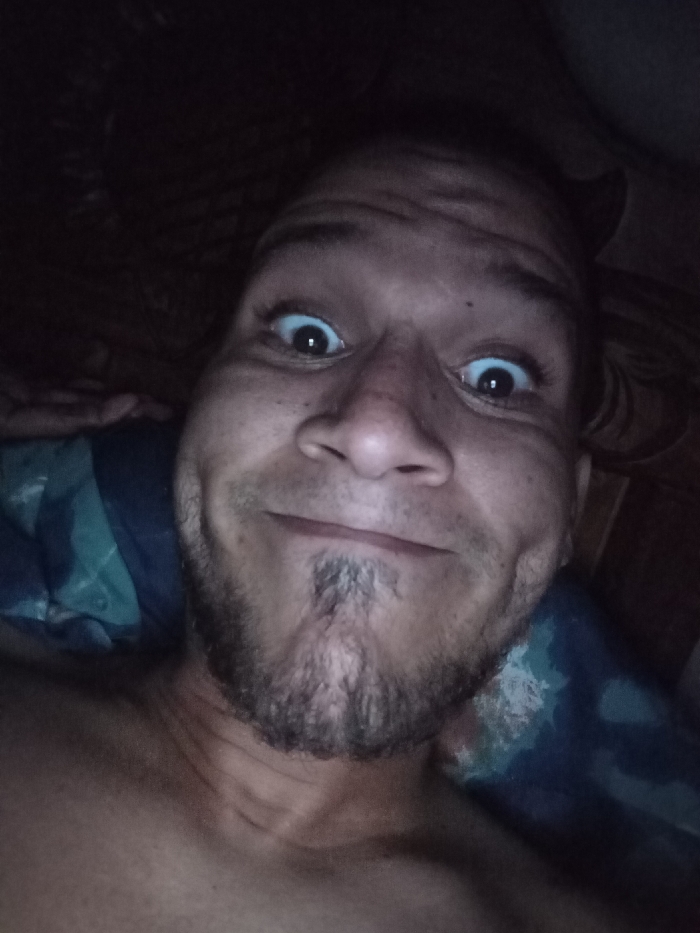 A close-up selfie of a man with dark hair and a beard, lying down on a blue-patterned pillow. His eyes are wide, and his expression is quirky, suggesting a playful or surprised mood. The lighting is dim, casting shadows on his face and upper body. He is shirtless and appears to be resting on a bed. The background is dark and indistinct.