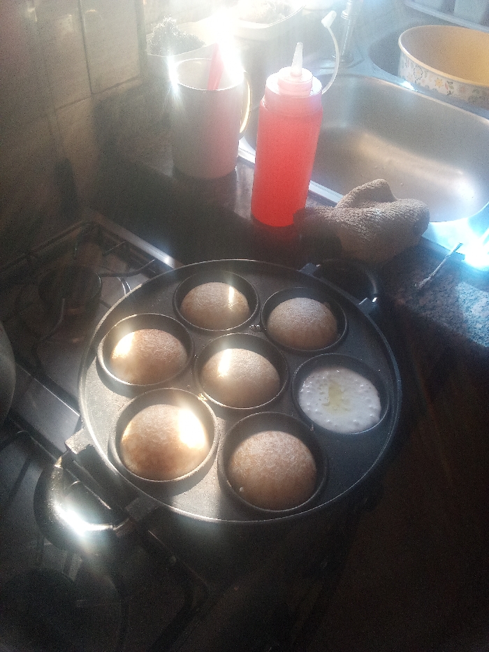 A sunlit kitchen scene shows a stove top with a cast iron muffin pan, filled with six round, tan-colored baked goods and one with white batter. A red squeeze bottle and a mug sit on the countertop next to a sink. A gray oven mitt rests beside the muffin pan, near the sink's edge. The scene is bathed in bright sunlight.