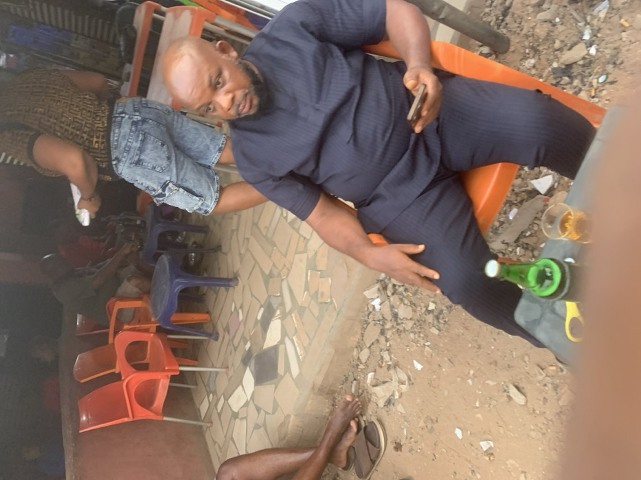 A man is seated outside on an orange plastic chair wearing a navy blue, short-sleeved shirt and dark pants