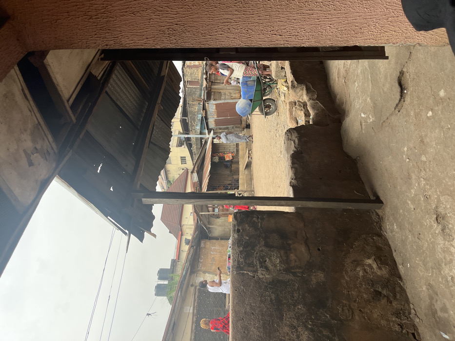 An urban scene is viewed through an opening. To the left, a weathered roof slants, juxtaposed with a sky of gray hues. In the middle distance, an individual pushes a wheelbarrow with blue containers. Across the passage, varied architectural styles are visible: a low-rise building, rusted tin roofs, and structures that suggest a blend of residential and commercial spaces. The passageway is rough with a narrow path flanked by weathered concrete walls.