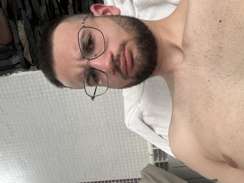 This image presents a frontal, chest-up view of a male individual, appearing to be a young adult. He has short, dark hair, a full dark beard, and wears thin-framed glasses. His body is bare-chested, revealing light body hair, and a white towel or bathrobe is draped over his shoulders and upper back. His facial expression shows his lips slightly pursed and pushed forward, conveying a pouting appearance, as he looks directly into the camera. A dark tattoo is partially visible on his left upper arm or shoulder. The background features two distinct wall coverings: to the left, a wall tiled with small, light-colored square tiles, and below it, a portion of a white radiator. To the right, behind the individual's head and shoulder, a section of wall is clad with dark, irregularly stacked stone or slate. The scene suggests an indoor environment consistent with a spa, sauna, or a similar relaxation facility. The image itself contains no specific visual markers that identify its location as Bansko, Bulgaria.