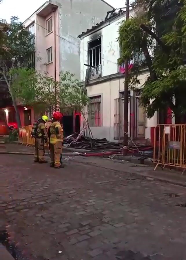 aftermath of a fire in front of a two-story building