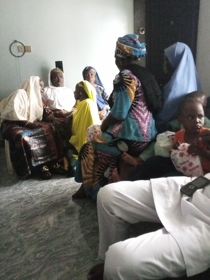 The image depicts an indoor gathering of at least eight individuals in Eika-Adagu New Layout, Nigeria