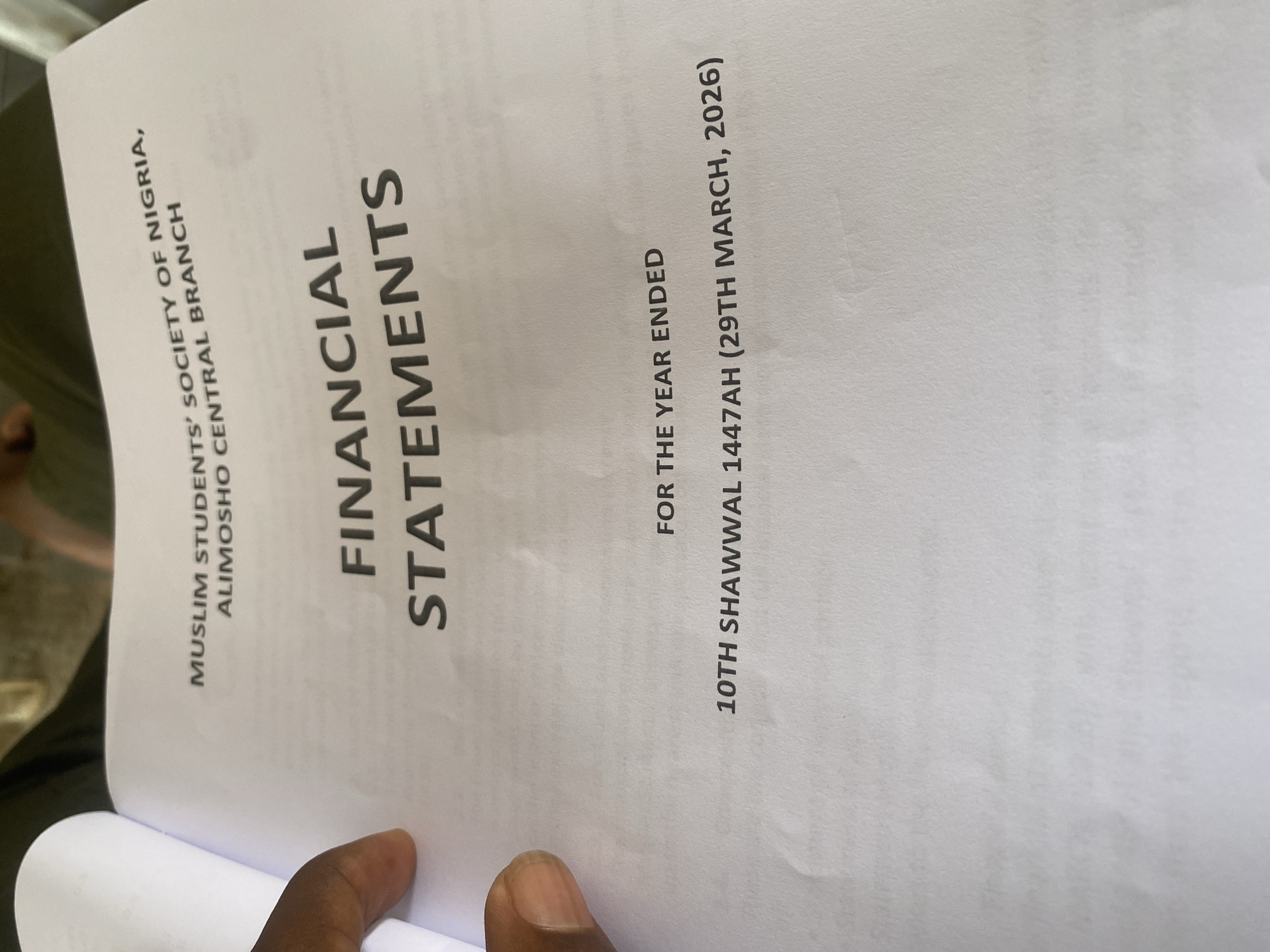 A slightly blurred, high-angle shot shows a page from a financial statement. The text on the page reads "MUSLIM STUDENTS' SOCIETY OF NIGERIA, ALIMOSHO CENTRAL BRANCH," indicating the location is Alimosho in Lagos, Nigeria. "FINANCIAL STATEMENTS" is printed in a larger font. Underneath, it reads "FOR THE YEAR ENDED 10TH SHAWWAL 1447AH (29TH MARCH, 2026)." Part of a person's left hand, with dark skin, is visible in the lower foreground of the image.