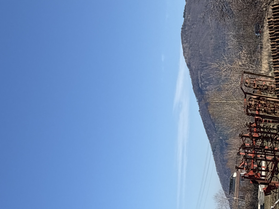 The image displays an outdoor scene in Kostenets, Bulgaria, under a clear, bright blue sky with minimal cloud cover. The upper two-thirds of the frame are dominated by this sky, featuring a few faint, thin white clouds positioned horizontally in the mid-left. A large mountain, densely covered with bare deciduous trees, occupies the lower right horizon and slopes upwards from the mid-left. In the immediate foreground, a collection of red, heavily rusted agricultural machinery components, possibly parts of cultivators or harrows, is prominent, extending from the left to the center-right. To the left of this machinery, a structure with a light-colored roof and dark walls is partially visible. Multiple overhead power lines run horizontally across the mid-ground from the left. Numerous bare trees and dry, light-brown vegetation are scattered throughout the mid-ground. A dark-colored vehicle is partially obscured by trees in the mid-right. On the far right foreground, a low, linear structure resembling a fence or stacked logs is visible. The bare trees and dry vegetation indicate a late autumn or winter season. No individuals are visible.