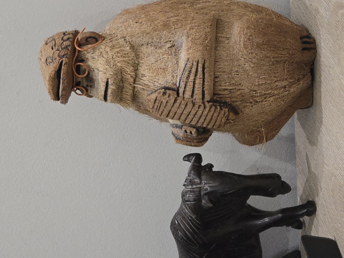 The image depicts a coconut monkey sculpture with a hat and glasses, sitting on a light wood floor in Bankya, Bulgaria. The monkey is holding a coconut in its hands. A black wooden sculpture of a wildebeest is situated on the floor to the left of the monkey, facing the right side of the image. The background is a light grey wall.