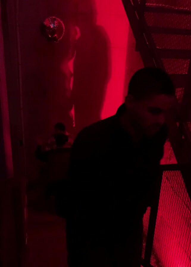narrow corridor bathed in red light. A man walks toward the camera, partially obscuring the view of people standing at a caged railing. The railing is next to a metal staircase. A disco ball is mounted on the wall, creating a large shadow behind the people at the railing. Music plays in the background.