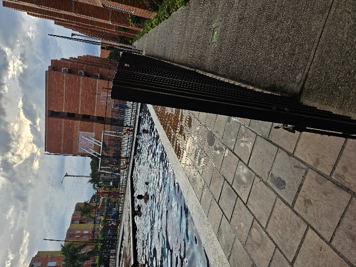 A rotated outdoor scene shows a swimming pool filled with people, flanked by a paved patio area. A dark metal fence separates the pool and the patio. In the background, tall brick apartment buildings rise under a cloudy sky. A basketball court and playground are visible in the distance. A high concrete wall sits beyond the patio.