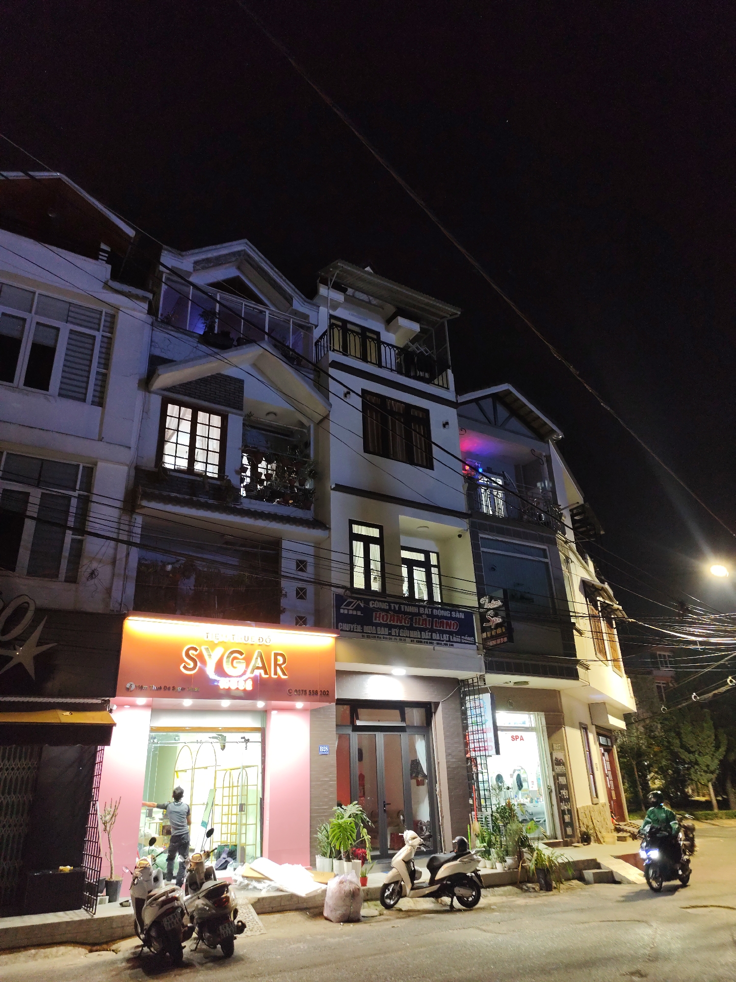 street scene in Da Lat, Vietnam, at night. The foreground is dominated by a row of buildings, with a business named "Sygar" illuminated by a bright orange sign. A man is inside the "Sygar" shop. Several scooters are parked on the sidewalk in front of the businesses. A person on a motorbike is driving on the street. Overhead power lines are visible against the dark sky. The street is lit by streetlights.