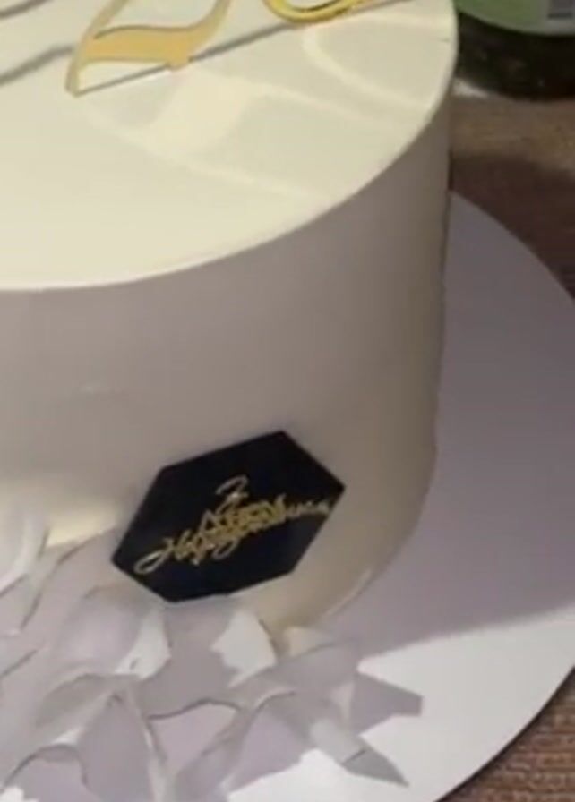 white-frosted cake with a label that reads "Happy Musa." Gold lettering on top of the cake indicates the number "20." There are gold candles on top of the cake. The cake sits on a white plate. The background is blurry.