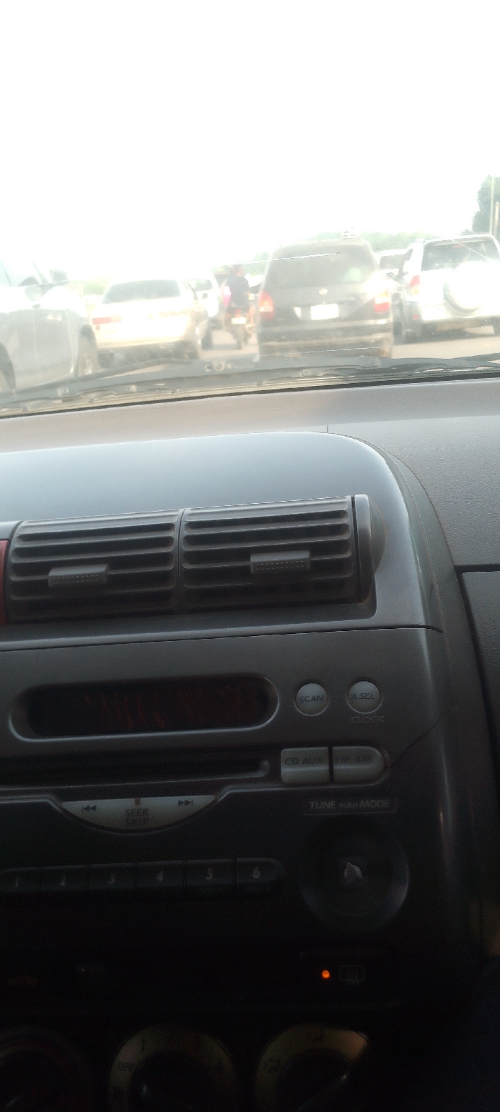 view of a car's dashboard from inside the vehicle. The dashboard is dark grey and features a car radio with buttons for "scan", "a sel", "clock", "cd aux", "fm am", "seek skip", "tune push mode", and numbered buttons for selecting radio stations. The radio also has a small, orange light illuminating the "defrost" button. The image was taken from the front passenger seat, and the view outside the vehicle is obscured by the windshield. The view outside shows several other cars, some of which are parked and some of which are driving. There are a few people visible in the background, but their faces are obscured. The scene is likely taking place on a road in Aso, Nigeria. The coordinates provided (latitude: 9.045, longitude: 7.535) are in the city of Aso, Nigeria.