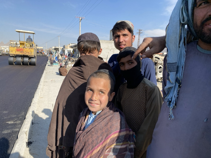The scene is set in Gundigan Village, Afghanistan, under a clear blue sky with bright daylight. In the foreground, five individuals are visible, mostly young males, positioned along a concrete curb beside a newly paved asphalt road. From left to right and front to back: * A young boy, approximately 6-8 years old, is positioned in the center-front, smiling directly at the camera. He wears a light blue shirt under a reddish-brown patterned shawl draped over his shoulders, and a small dark cap on his head. * Behind and slightly to the boy's right stands another child, roughly 8-10 years old, whose face is largely obscured by a dark brown shawl wrapped around him. A dark cap is visible on his head, and his eyes are looking towards the camera. * Behind these two, to the right, a third child of similar age, approximately 8-10 years old, wears a black balaclava covering the lower half of his face and a patterned olive-green long-sleeved shirt. His eyes are directed towards the camera. * Further back and to the right of the masked child is a young man or teenager, possibly 16-20 years old, wearing a light-colored patterned cap and a dark shirt, also looking towards the camera. * On the far right, partially visible, is the right side of an adult male's face with a beard. He wears a light blue patterned shawl draped over his shoulder, and his right hand is extended, with an index finger pointing towards the head of the child in the black balaclava. In the midground, to the left of the individuals, a large yellow road roller (compactor) is actively paving the road, moving away from the viewer on freshly laid black asphalt. An operator is visible within the roller's cab. Beyond the road roller, the background reveals a village or town setting with various single-story and multi-story buildings, utility poles with power lines, and blurred figures of more people in the distance. The road extends into the background, flanked by buildings.