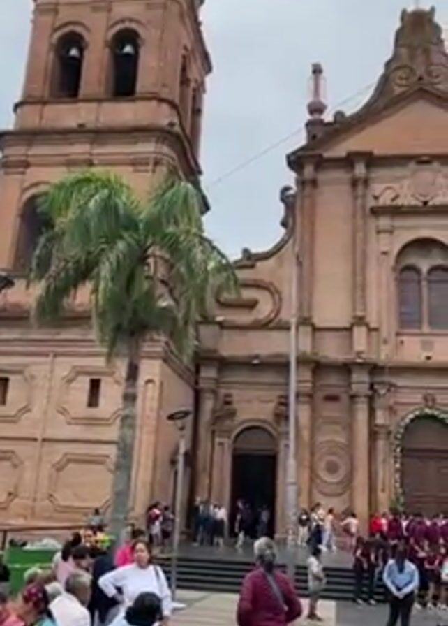 Basilica Menor de San Lorenzo Cathedral in Santa Cruz, Bolivia. The brick cathedral has a tall tower to the left, and a large door in the center with a rounded roof. People are gathered on the paved plaza in front of the cathedral. A group of students are on the steps in front of the doorway. Some people are walking across the plaza, while others stand and look around. The weather appears overcast.