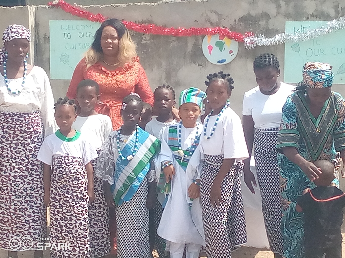 group of people standing outdoors, likely in Ajaokuta, Nigeria. In the center is a woman in an orange dress. In front of her and to her sides are children and adults. The people are wearing traditional clothing, including patterned skirts, white tops, and beaded necklaces. Some wear head coverings. Behind the group is a light-colored wall with two signs attached that say "Welcome to our Culture." Above the signs is a garland of red and white tinsel, and a paper cutout of the earth. A logo is visible at the lower left of the image.