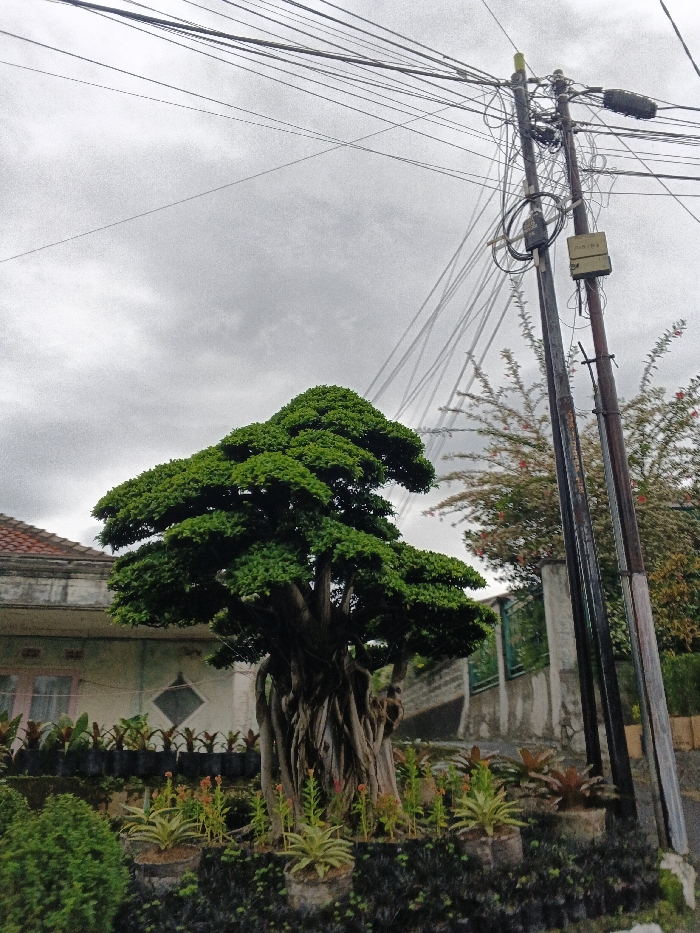 The image captures an outdoor scene under an overcast sky in Lvea Aem District, Cambodia. A large, robust tree with a prominent, complex interwoven root system forming its trunk and dense, layered green foliage dominates the lower-middle foreground. Below and surrounding the tree, a garden bed contains various potted plants, including small green-leafed varieties, taller plants with reddish flowers, and a row of plants in black plastic bags along a raised platform. To the left, part of a light-colored building with a reddish-brown tiled roof, a visible window, and a decorative diamond-shaped vent is present. On the right, two dark utility poles rise vertically, heavily laden with numerous black electrical and communication wires crisscrossing the upper frame. Attached to the poles are various electrical boxes, including a beige rectangular box labeled "PARKIR". Behind the poles, a gray concrete wall and a partially visible green metal gate are discernible. No individuals or animals are present within the frame.