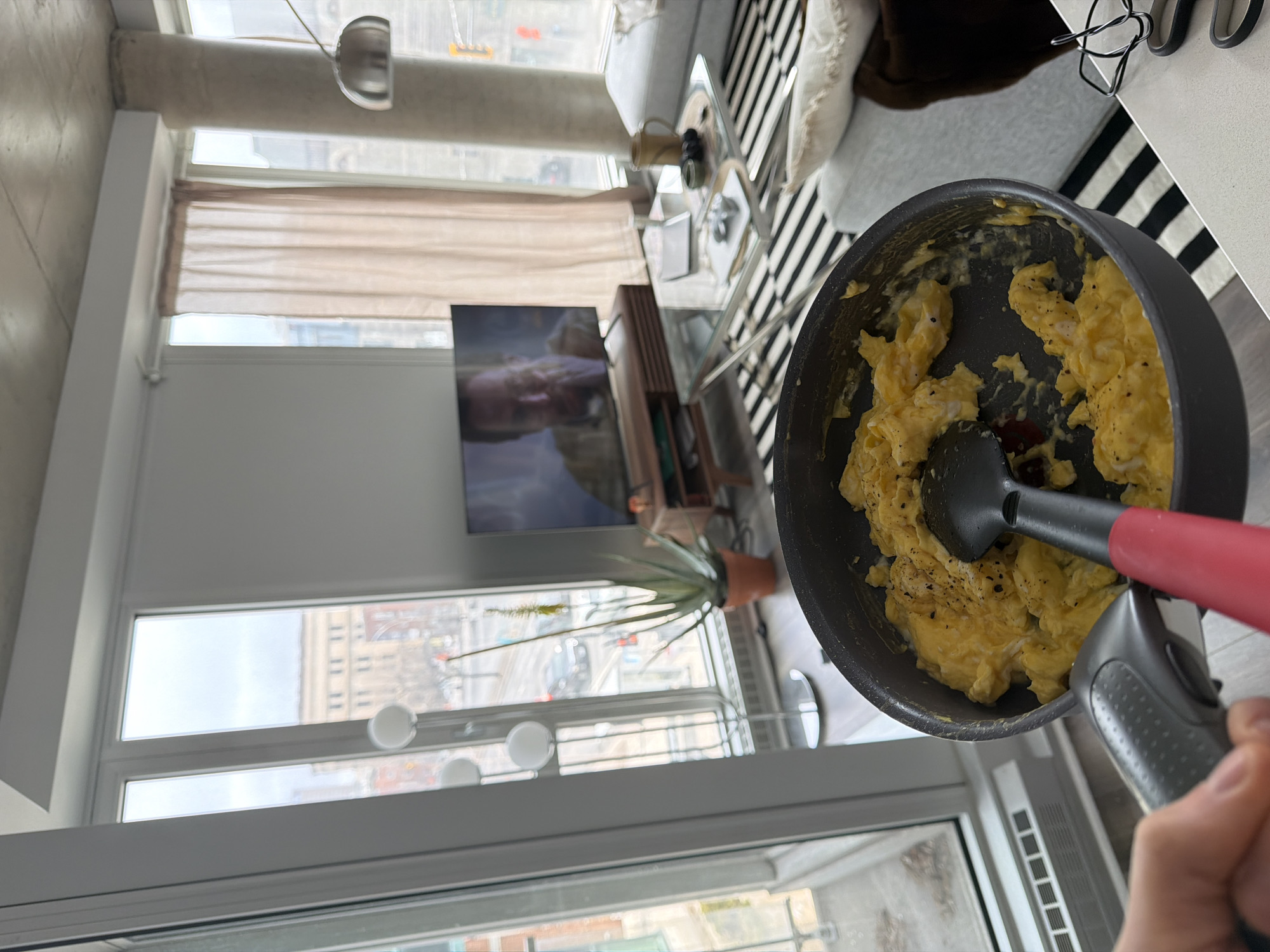 A high-angle shot shows a person holding a frying pan of scrambled eggs, with a spatula inside. The pan is positioned against a backdrop of a modern interior. Behind the pan, there is a floor-to-ceiling window. Through the window, there is a view of the urban cityscape of Montreal, Canada, identified by the distinctive architecture visible, including brick buildings and cityscapes. Inside the apartment, a television is visible, along with a plant in a terracotta pot, a console table, and a sofa partially visible in the background. A sheer curtain hangs near the top of the window.