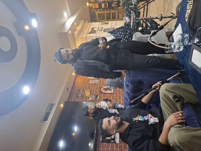 A group of people are in a room, possibly a cafe or lounge. One person is standing, holding a glass, while others are seated on a blue tufted sofa, some holding hookah pipes. A child lies on a nearby surface. The room has brick walls decorated with various items. A television is visible in the background. There are drinks on a table next to the sofa. The lighting is bright, with prominent ceiling fixtures.