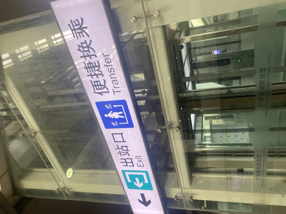 The image showcases a sign with Chinese and English text inside what appears to be a glass elevator or lift. The sign indicates "Exit" and "Transfer." A pictogram depicting a woman in a dress in a wheelchair is also present. On the glass of the elevator are the phrases "广州南站欢迎您" and "Welcome to Guangzhounan Railway Station", repeated. This implies the elevator is in or leads to the Guangzhounan Railway Station.