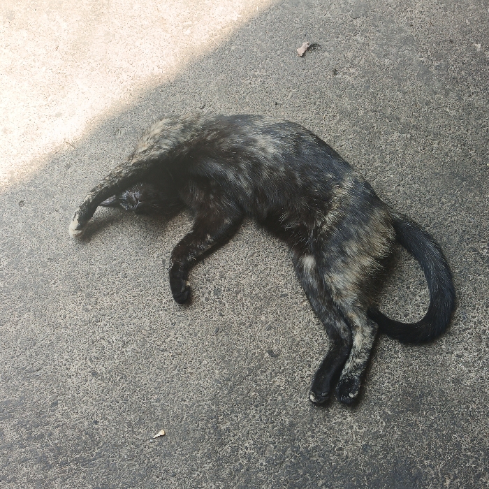 - "The scene displays a deceased tortoiseshell cat lying on a grey, textured concrete or asphalt surface" by FM-ALdt42, licensed under CC BY 4.0