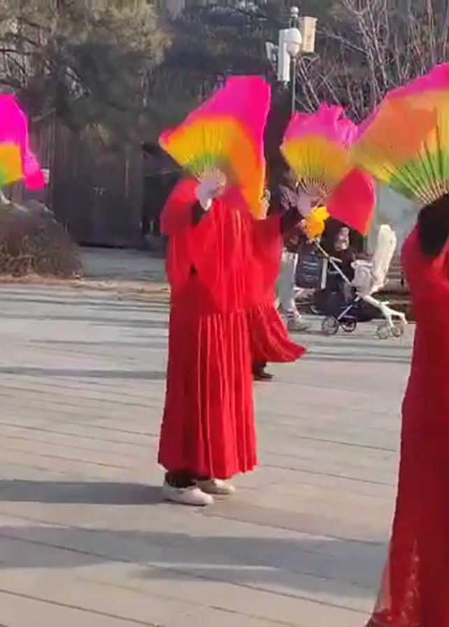 A group of women and one man are performing a fan dance in a park-like setting. They are all dressed in red robes with unique headwear and are using large fans that transition from pink to yellow to green. The dancing takes place on a paved area with trees and other people visible in the background. There is a small black speaker on the ground near the dancers, presumably playing the music for their routine. The camera moves around to capture different angles of the group. Passersby can be seen in the background, one pushing a stroller.