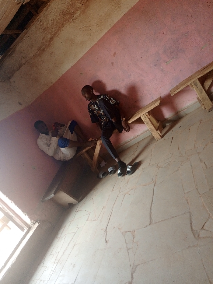 - "The photograph, taken at an oblique angle in Akwanga, Nigeria, depicts an indoor scene featuring two adult males and rudimentary wooden furniture within a room exhibiting signs of wear" by FM-VmtQH2, licensed under CC BY 4.0