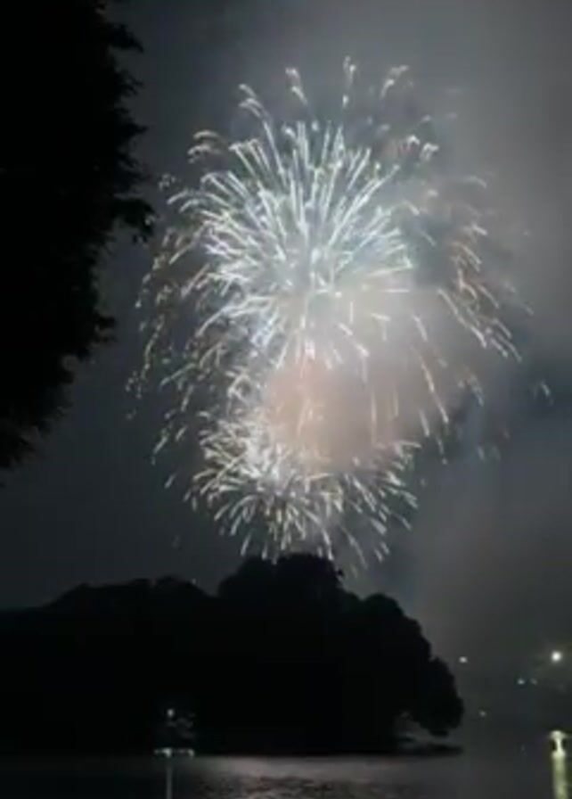 fireworks exploding in the night sky over a body of water. In the foreground, the silhouette of a tree is visible on the left. A dark landmass appears in the middle ground across the water. The fireworks themselves are bright and colorful, with bursts of white and red. Smoke from the explosions partially obscures the sky. A lamppost can be seen on the far right of the scene. The water is calm and reflects the lights.