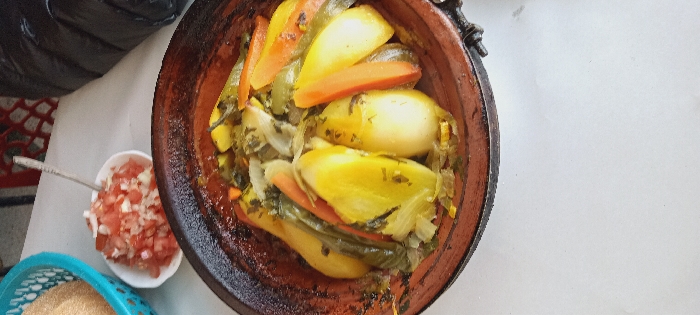 The scene depicts a meal set on a white table, likely within an eating establishment in Sidi Allal El Bahraoui, Morocco. The central object is a traditional Moroccan tagine dish served in a terracotta clay base, containing a medley of cooked vegetables. Visible components within the tagine include large pieces of yellow-skinned potatoes, bright orange carrot sticks, and green leafy vegetables, possibly cabbage or fennel, all glistening with cooking liquids. To the upper left, a small white bowl holds a serving of finely chopped red tomatoes and white onions, with a small silver spoon resting within it. Adjacent to this bowl, a portion of a blue plastic basket is visible, containing a light brown, granular substance, consistent with couscous or semolina. In the upper right background, a dark, possibly black, padded jacket or garment is partially visible, alongside a segment of a red plastic chair. No individuals are directly visible, and no active interactions are depicted; the scene suggests a prepared meal ready for consumption.