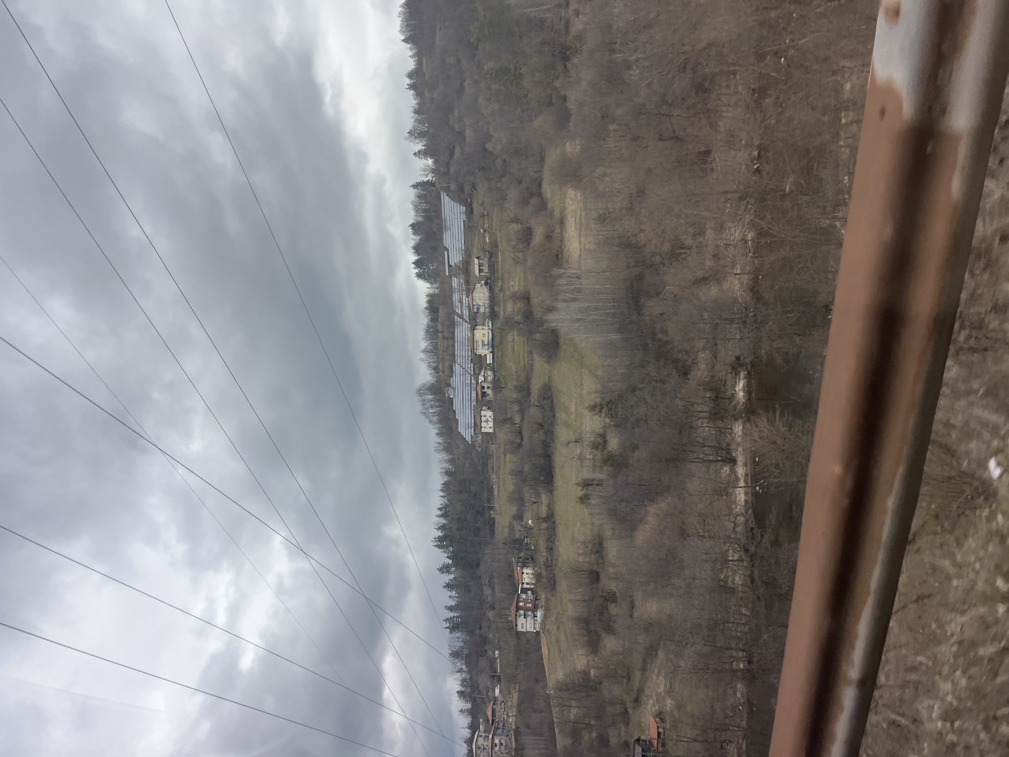 The image presents a rural landscape in Lovtsi, Bulgaria, under an overcast grey sky. In the immediate foreground, a weathered, rusty brown metal guardrail extends horizontally across the lower third of the frame, partially obstructing the view. Beneath the guardrail, a dark, calm body of water, likely a river, is visible, its banks lined with dense, leafless deciduous trees and shrubs. The terrain ascends into a series of hillsides covered predominantly by dry, brown, leafless vegetation, scattered bare trees, and patches of pale grass. On the left-middle slope, a cluster of residential buildings with light-colored facades and red-tiled roofs is present. Higher up and towards the center-right, another group of similar buildings is visible. On the upper slopes of the central hill, a prominent series of multiple long, light-colored structures with uniformly angled, reflective surfaces are arranged, consistent with either large greenhouses or solar panel installations. The hilltops are densely forested with dark green coniferous trees. Multiple thin, dark utility lines diagonally traverse the upper portion of the frame against the cloudy sky. No individuals, explicit actions, or interactions are discernible within the scene.