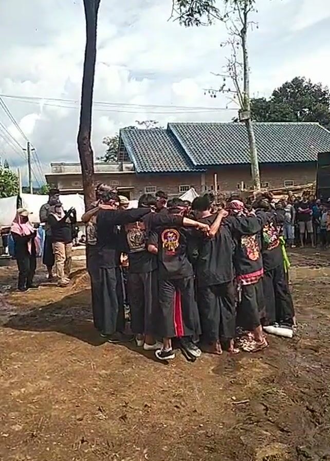 A group of people are tightly huddled together outdoors on a dirt ground. Most are wearing matching black outfits with red accents on the sides. Beyond them is a crowd of people and a banner that reads "LASKAR TUNAS." In front of the huddled group, an individual in dark clothing performs a series of movements. A person wearing a black outfit and a black bag is lying on the ground in the foreground. A building with a dark roof and clear skies are visible in the background.
