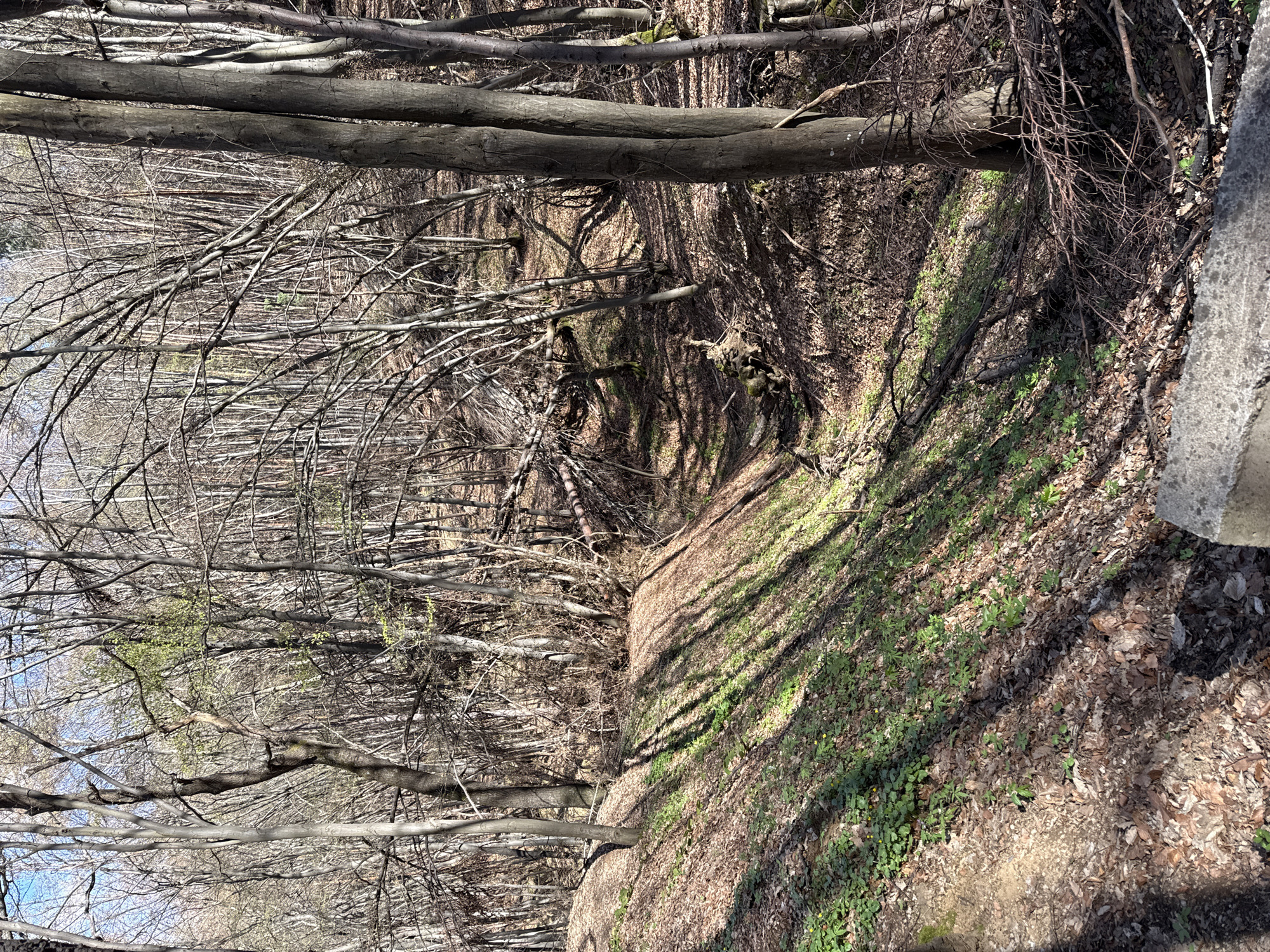 The image depicts a forest scene, likely in the vicinity of Belchin, Bulgaria, although no definitive landmarks confirm the exact location. On the left side of the image is a dense stand of trees with bare branches, suggesting it might be early spring or late autumn. New growth is apparent on a few trees. Several fallen logs are visible. To the right, the ground slopes upward, covered with dry leaves and patches of green vegetation. A section of concrete is visible on the top right side. There are no people or animals visible in the image.
