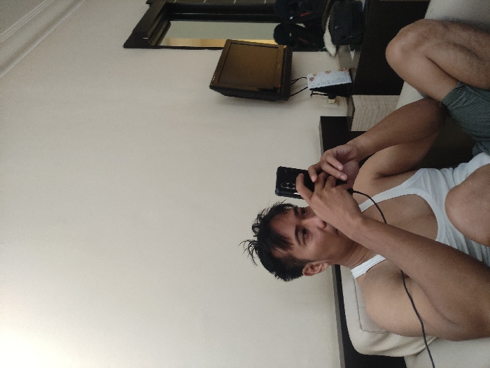 - "A man wearing a white sleeveless shirt and green shorts is sitting on a light brown sofa in a room" by FM-24rmI2, licensed under CC BY 4.0