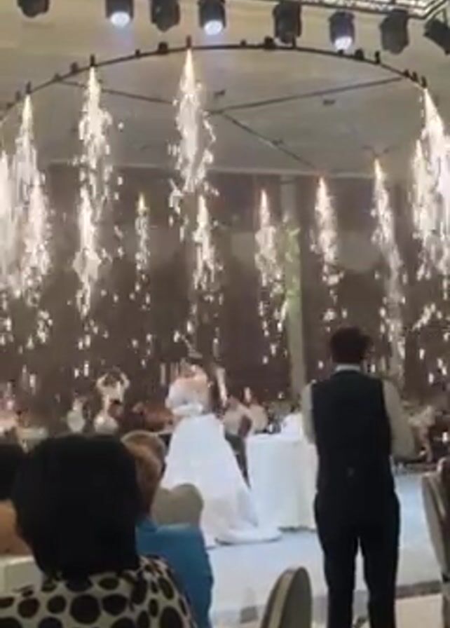 A well-lit wedding reception hall showcases a first dance between a bride and groom. The bride is wearing a white wedding dress. The groom is wearing a light-colored shirt and dark pants. The dance takes place under a circular structure emitting downward streams of sparks. Several tables around the dance floor are filled with guests watching the couple. A waiter stands off to the side, observing. The overall atmosphere is celebratory.