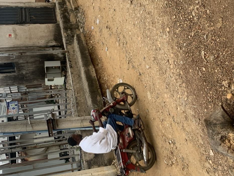 A man sits on a red moped, wearing a white shirt and blue jeans, facing left. The moped is angled on a dirt and stone ground, alongside a gray curb. Behind the curb are metal poles, an open electrical box, and a weathered concrete wall. A tree stump sits on the right edge of the dirt ground. The image is slightly rotated counter-clockwise.