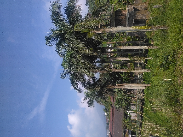 This image depicts a rural or semi-rural scene in Ciloto, Indonesia, under a clear blue sky with sparse white clouds. The foreground consists of dense, overgrown green vegetation, including tall grasses and various shrubs. Seven prominent, slender-trunked palm trees with dark green fronds dominate the midground, extending across the frame. Behind these palms, a weathered wooden pathway or bridge with light-colored railings runs horizontally. To the right, a two-story stone structure, appearing somewhat dilapidated, features a rectangular lower section and an octagonal upper section. To the left of this structure, a large building with a dark, reddish-brown tiled roof is partially visible, partially obscured by lush greenery. Distant hills or mountains are present in the hazy background, with additional structures discernible on their slopes. No individuals are present.