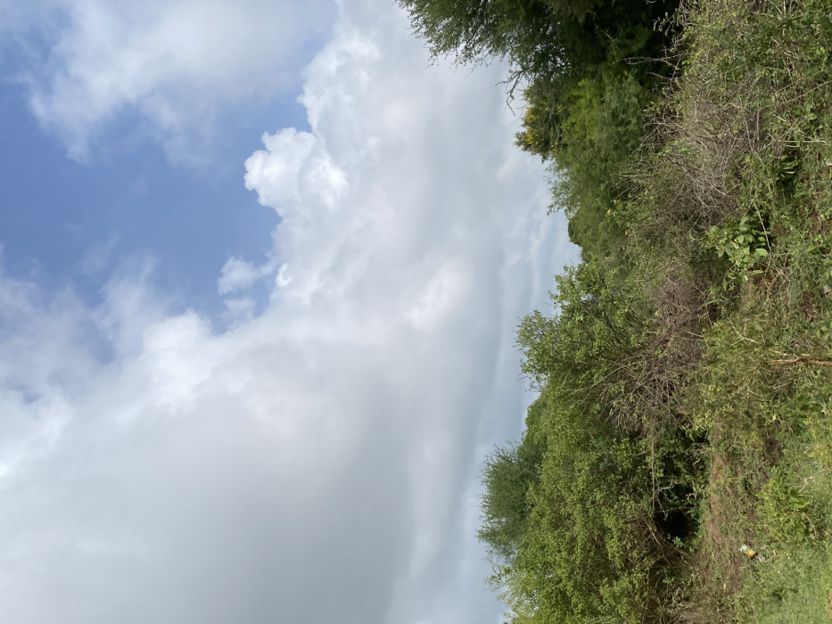 The image depicts an outdoor natural environment located in Makutano-Mwala ward, Kenya. The upper half of the frame is dominated by a sky featuring extensive white and light grey cumulus cloud cover, with patches of clear blue sky visible predominantly in the upper right and central areas. The lower half of the frame shows dense, mixed vegetation consisting of various shrubs and bushes. In the immediate foreground and midground, there is a mix of vibrant green leafy plants and dry, woody shrubs with visible brown branches and sparse foliage. Taller, denser green trees are visible in the background, forming a horizon line of foliage. A small area of exposed earth with some faint light-colored debris (possibly litter) is present at the bottom left. No human subjects, animals, or man-made structures are visible. The scene suggests a rural or undeveloped landscape under overcast but partially clear skies.