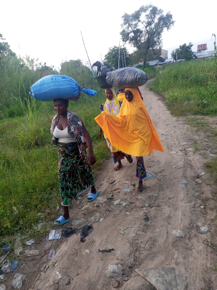 The image depicts four individuals, likely females, walking in single file on an unpaved dirt path in Adankolo, Nigeria. The path is flanked by dense green vegetation, including tall grasses and shrubs, with trees and distant buildings visible under an overcast sky in the background, suggesting a semi-urban or rural-urban fringe setting. The lead individual, positioned on the left foreground, is a dark-skinned female wearing a white tank top, a patterned sleeveless wrap, a dark green patterned wrapper, and light blue slide sandals. She carries a large, irregularly shaped blue sack, secured with blue rope, balanced on her head. Her facial expression shows a slight smirk or smile as she looks slightly towards the camera. Behind her, moving right, is a second dark-skinned female, partially obscured. She wears a light-colored, possibly patterned garment and carries a dark grey or black bundle on her head. Further behind and to the right is a third dark-skinned female, barefoot, wearing patterned trousers and a bright yellow, flowing head covering that drapes over her upper body. She carries a dark, grey or black, large bundle on her head. A fourth individual is partially visible in the far background, also appearing to carry a load on her head. The dirt path is uneven and strewn with various pieces of litter, including plastic bags, wrappers, and fragments of debris. The individuals are engaged in the act of carrying goods on their heads while traversing the path.