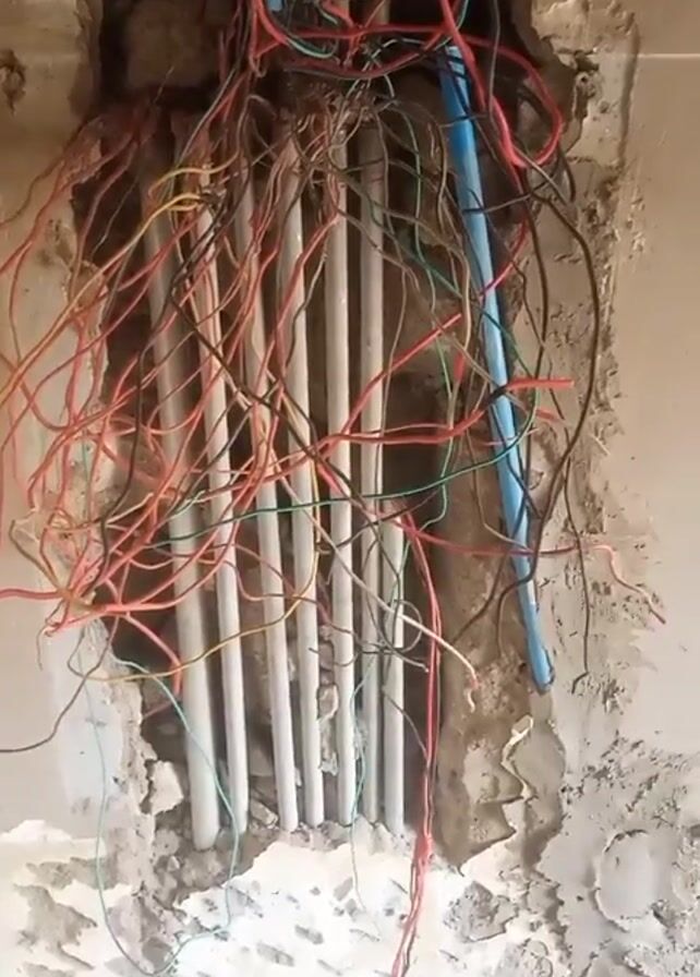 The video starts with a close-up of a hole in a wall filled with wires and pipes