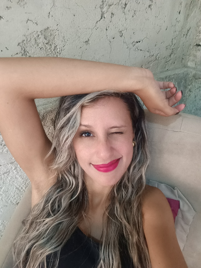 A female subject is depicted in a close-up, chest-up portrait. She has long, wavy hair with blonde and brown highlights. Her left eye is closed in a wink, while her right eye, displaying a blue iris, is open. Her mouth is smiling, revealing lips colored with bright fuchsia lipstick. She wears a black top, possibly strapless or with thin straps. Her right arm is bent and raised, with her hand resting on her forehead. The subject is seated on a light beige upholstered surface, likely a chair or sofa. The background consists of an uneven, textured wall with a light gray or off-white finish. The scene is located in Las Tejerías, Venezuela.