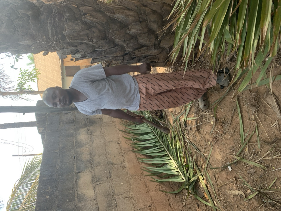 An adult male stands outdoors in what appears to be a yard or undeveloped area within Unknown, Unknown. He possesses a dark complexion, a shaved head, and wears a light grey V-neck t-shirt, tan sweatpants patterned with "BALENCIAGA" text, and dark grey Crocs. He holds a dark wooden stick in his left hand, while his right hand is fisted at his side. He faces slightly left of the camera with a neutral expression. Behind him on the left is a concrete block wall with green vegetation (possibly aloe vera) at its base. To his right, a large, textured tree trunk, consistent with a palm tree, is visible. The ground is dry, reddish-brown dirt covered with numerous green palm fronds, both whole and fragmented, particularly to the man's left and near the base of the large tree trunk. In the background, a light-colored building with a corrugated metal roof is partially visible. Overhead, faint utility lines are present against the bright sky.