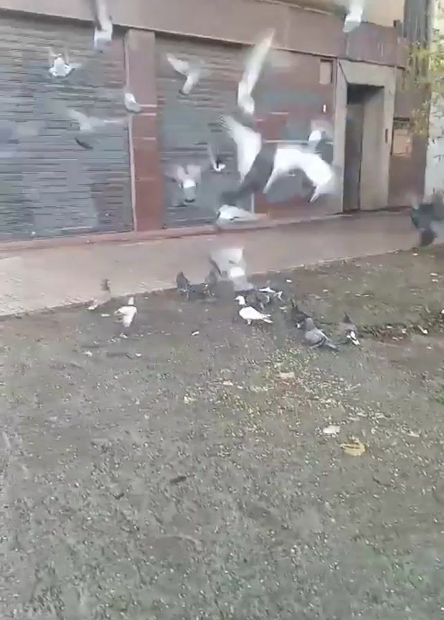 The scene shows a flock of pigeons taking flight in front of a building with closed roll-up doors