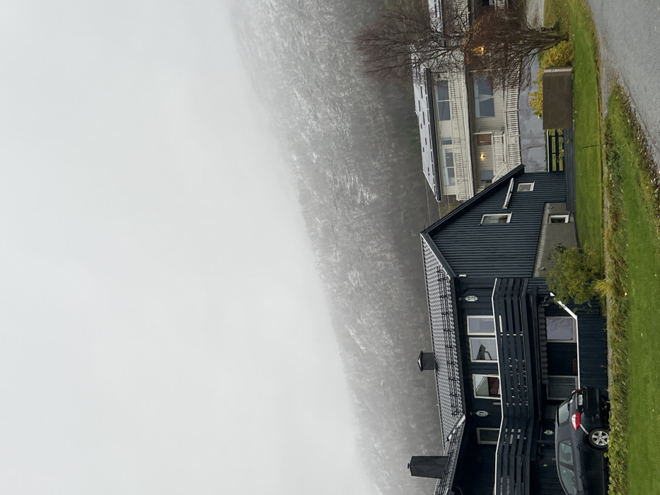This image depicts a residential scene on Åsgårdvegen in Tromsø, Norway, specifically near Åsgårdvegen 31 on Tromsøya island, with a view facing east towards the lower slopes of Fløya mountain. The scene is dominated by overcast conditions, with low-hanging clouds and fog obscuring the upper sections of the steep, tree-covered mountain in the background. Patches of light snow or frost are visible on the mountain's lower slopes and tree branches. In the foreground, a dark grey or blue two-story residential building with vertical wooden siding and a dark tiled roof is prominent on the left. It features two prominent balconies with dark railings. A black five-door hatchback vehicle, likely a Volkswagen Golf, is parked on a paved driveway partially on a green grass verge adjacent to the house. To the right of the dark house, and situated on slightly higher ground, is another multi-story residential building. This house appears lighter in color, possibly off-white or cream, with horizontal siding and multiple balconies featuring white railings. Its roof also exhibits a light dusting of snow. A bare deciduous tree stands between this house and the dark foreground house. The immediate foreground consists of vibrant green grass, suggesting ground temperatures above freezing, contrasting with the snow on the distant mountain and rooftops. No individuals are present in the frame, and no specific actions or interactions are depicted.