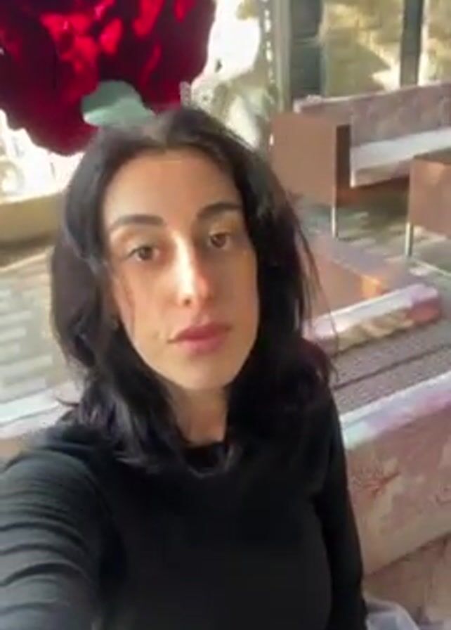 A woman with dark hair, wearing a black long-sleeved shirt and a black watch on her left wrist, is holding a phone and filming herself. She is looking at the camera, and touches her hair. Behind her are some outdoor lounge chairs and a large, red rose decoration. The background is slightly blurred, but a brick wall and some foliage are visible. There is a sound like white noise, or water, in the background.