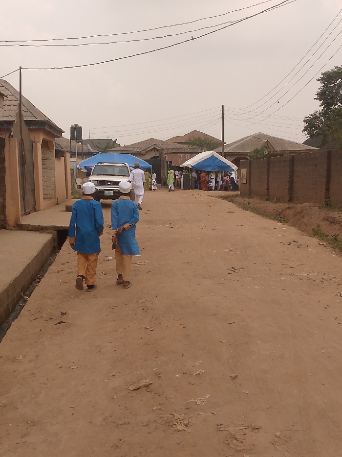The scene depicts a street in Ijoko, Nigeria, under an overcast sky. A wide, unpaved dirt road dominates the foreground and midground, exhibiting minor debris and tire tracks. On the left, a concrete sidewalk borders a shallow, concrete-lined drainage ditch, running alongside a single-story building with a brown tiled roof and light-colored walls. A black water tank on a stand is visible behind this building. In the foreground, two young individuals, viewed from the back, walk away from the camera on the dirt road. Both wear similar attire: blue long-sleeved tunics over tan trousers, topped with white caps. The individual on the left is slightly ahead. Further down the road, a gathering of people is visible under two prominent blue and white striped canopies positioned on either side of the road. A white Nissan SUV or pickup truck, bearing a Nigerian license plate, is parked beneath the canopy on the left. Another individual in a white robe and cap walks towards this gathering. Additional people, dressed in various traditional and contemporary clothing, are observed standing and interacting beneath and around the canopies, suggesting a social event or meeting. Residential buildings with brown tiled roofs and varied wall colors line both sides of the street in the midground and background. On the right, a segmented brick wall borders the road, and a wooden utility pole supports overhead power lines that stretch across the frame. Sparse green foliage is visible on the far right.