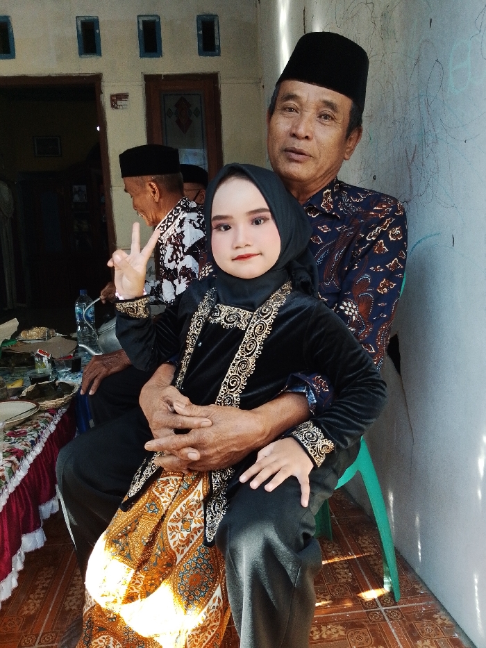 In Juwana, Indonesia, an image features an adult male and a child seated in a semi-outdoor setting. The adult male, on the right, wears a black peci and a dark blue batik shirt, and is seated on a light green plastic chair. He holds a child on his lap, with his hands clasped over the child's left leg. The child, centrally positioned, wears a black hijab and a black velvet outfit adorned with gold and white embroidery, and has visible facial makeup. The child's right hand forms a "V" sign, while the left hand rests on the adult's leg. Both subjects in the foreground look directly forward. To the left in the midground, an elderly male, wearing a black peci and a patterned batik shirt, is seated facing away from the camera, partially obscured. A low table, covered with a white and red frilly tablecloth, holds plates, a plastic water bottle, and wrapped food items. The background includes a light-colored wall with faint markings on the right, and a light brown wooden door with three rectangular openings above it on the left. The floor is composed of patterned ceramic tiles. Direct sunlight illuminates portions of the scene, casting distinct shadows.