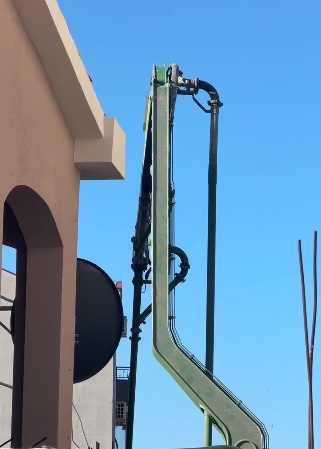 piece of industrial equipment, seemingly a concrete pump, standing tall against a clear blue sky. It's painted in shades of green, and features pipes and mechanical components. The equipment is located on a rooftop, adjacent to a building with an arched window and a satellite dish. The building is painted a light beige color. Two metal rods are visible to the right of the equipment.