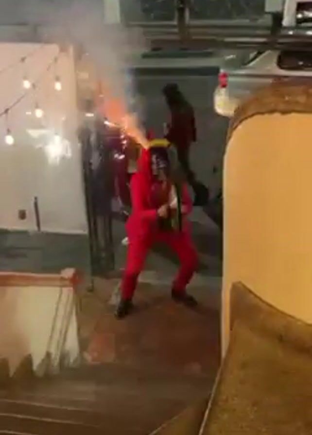 costumed performers dancing on a patio. The performers are wearing matching red suits and elaborate masks. The masks are dark in color and adorned with colorful dreadlocks. One of the performers has a contraption on their head that is emitting sparks and smoke. The dancers are in front of a white wall with string lights. Beyond the patio is a street with parked cars. The view is from a higher vantage point looking down a set of stairs.